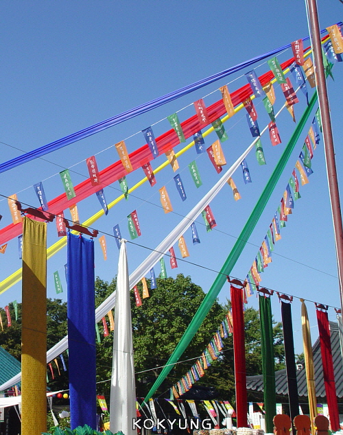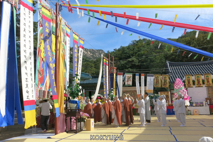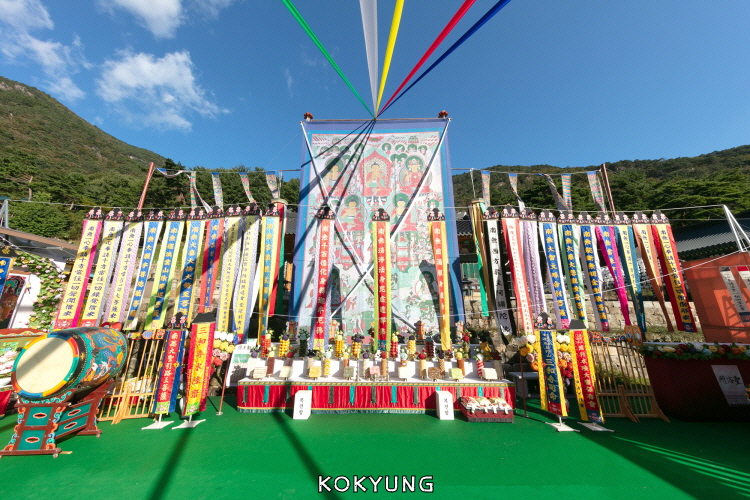 야외에서 의례를 봉행할 때면, 거대한 괘불과 그 아래 공양물을 갖춘 재단齋壇은 하늘과 산을 배경으로 대자연의 성전聖殿이 된다. 불단 좌우에는 묵직한 번幡과 당幢이 포진하고, 허공을 가로질러 크고 작은 오색의 종이 번이 바람에 나부끼며 장관을 이룬다. 도량을 감싼 번들은 공동체의 소망을 펼쳐나갈 종교 축제의 위용과 환희로움을 느끼게 하는 소중한 요소이다.