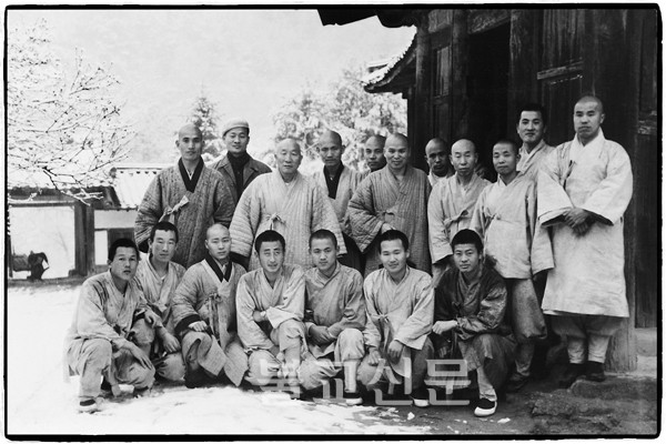 | 김룡사에서 구도부 학생, 대중 스님들과 자리를 함께 한 성철스님(뒷줄 가운데). 앞줄 왼쪽부터 김금태, 이진두, 한 사람 건너 김기중, 이철교, 김성구, 황귀철. 뒷줄 왼쪽 현경스님과 박성배 교수(배레모), 오른쪽에서 두 번째는 전창열. 사진제공=성철선사상연구원 | ||
