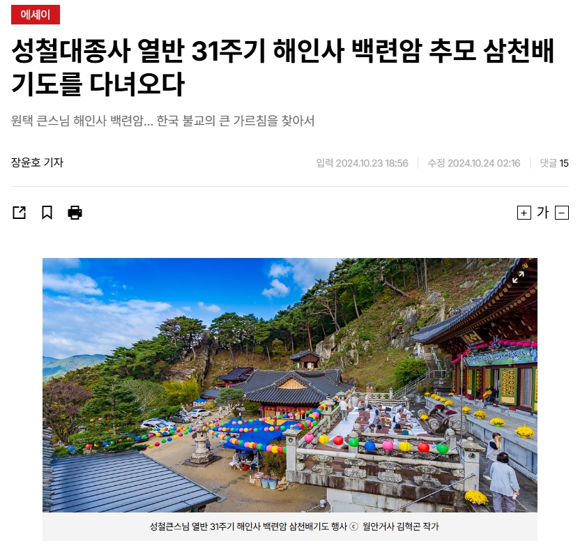 성철대종사 열반 31주기 해인사 백련암 추모 삼천배 기도를 다녀오다 페이지 정보 작성자 관리자 쪽지보내기 메일보내기 자기소개 아이디로 검색 전체게시물 쪽지보내기 메일보내기 자기소개 아이디로 검색 전체게시물 작성일24-10-24 10:22 조회3,757회 댓글0건 본문 성철대종사 열반 31주기 해인사 백련암 추모 삼천배 기도를 다녀오다 < 에세이 < 라이프 < 기사본문 - 프리진경제 기사 보기 => https://www.freezine.co.kr/news/articleView.html?idxno=3386&fbclid=IwY2xjawGGf5NleHRuA2FlbQIxMQABHQQRYnEBd6eu-szCQl0d2-qJY_JVs02anYzv91_H14LwFf-sNHpwnT9Lfw_aem_psQ4eM1ccbyAJQ2Qf_XwsQ 이전글 다음글 목록 댓글목록 등록된 댓글이 없습니다.