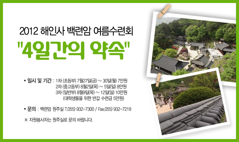 2012 해인사 백련암 하계수련회 '4일간의 약속' 페이지 정보 작성자 최고관리자 쪽지보내기 메일보내기 자기소개 아이디로 검색 전체게시물 쪽지보내기 메일보내기 자기소개 아이디로 검색 전체게시물 작성일12-06-15 11:23 조회31,713회 댓글0건 본문 자세한 사항은 아래의 주소를 클릭하시기 바랍니다. http://sungchol.org/home/bbs/board.php?bo_table=03_11&wr_id=120 이전글 다음글 목록 댓글목록 등록된 댓글이 없습니다.