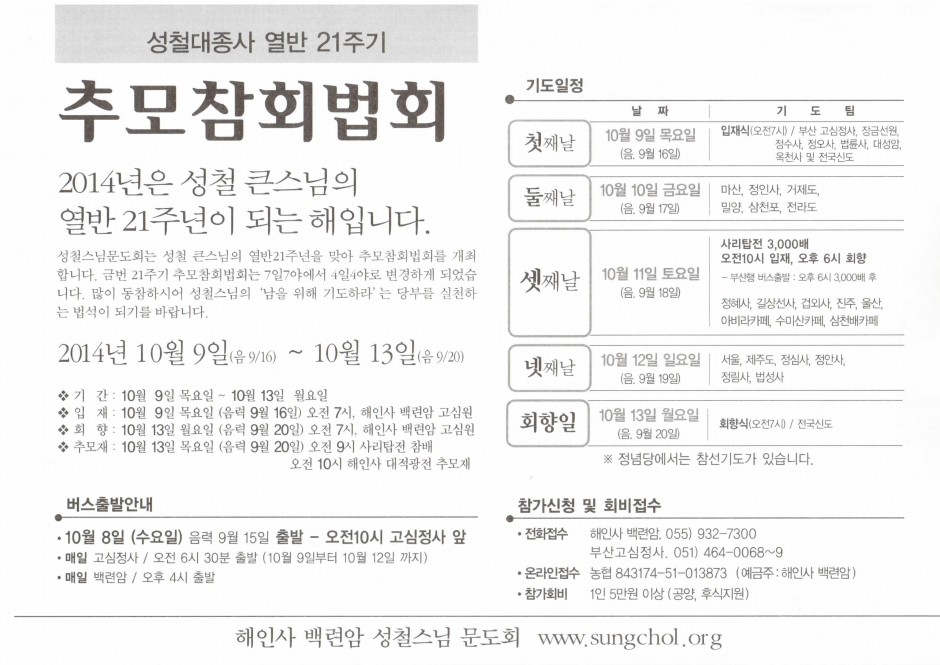 성철 큰스님 열반 21주기 추모행사 안내 페이지 정보 작성자 최고관리자 쪽지보내기 메일보내기 자기소개 아이디로 검색 전체게시물 쪽지보내기 메일보내기 자기소개 아이디로 검색 전체게시물 작성일14-10-07 09:35 조회29,464회 댓글0건 본문 ^^ 이전글 다음글 목록 댓글목록 등록된 댓글이 없습니다.