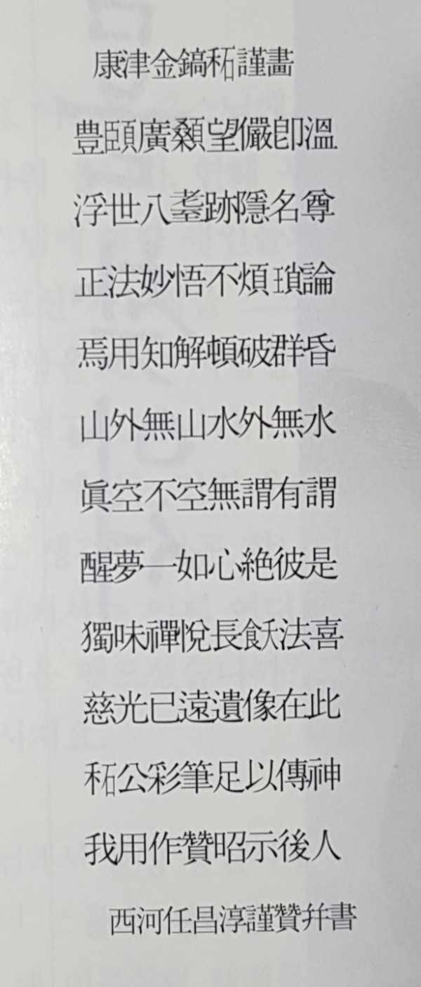 ※ 이 글은 지난해 12월 1일 남양주군 지곡서당에서 청명 임창순 옹이 짓고 화폭 위에 직접 쓰신 큰스님의 진영찬입니다. 이 일은 불교와 유교의 최고봉인 두 분이 정신적으로 교류하는 것이며, 당대의 큰 인물의 초상화에 다른 큰 인물이 인물평을 기록하던 옛 문화적 전통을 살려냈다는 점에서 그 의의가 크다고 할 수 있습니다. 任옹은 “이 시대 스승으로 추앙받던 성철스님의 면모와 사상을 집약적으로 표현하려 했다"고 찬을 짓고 쓰신 소감을 피력하셨습니다. 이 지면을 빌어 심심한 감사의 말씀을 드립니다.