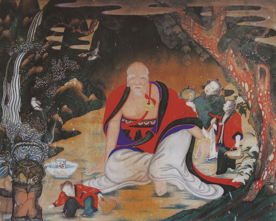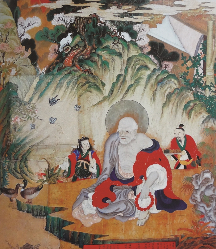 천태산에서 구름과 소나무를 배경으로 유희좌로 앉아 계시는 희고 긴 눈썹의 나반 존자는 왼쪽 어깨를 드러내고 왼손에는 염주를 들고 계신다. 이런 위의는 독성청 유치由致에 나오는 “만약 누구라도 공양을 올리면 반드시 신통스러운 감응을 내리시어, 구하는 것을 모두 이루게 해 주시고, 원하는 것을 모두 좇아 소원을 이루게 하지 않음이 없다[若伸供養之儀, 必賜神通之鑑, 有求皆遂, 無願不從].”는 내용을 시각적으로 표현한 것에 다름 아니다. 나반존자 좌측에는 진각 거사眞覺居士가 다소 익살스런 표정으로 천도天桃와 다기茶器를 들고 있으며 우측의 선의 동자善衣童子는 불로초가 가득 담긴 망태기를 메고 있다. 주위의 배경은 유치의 내용을 그대로 표현해 놓았다. 즉 “은은한 산, 잔잔한 물가에 한 간 난야를 짓고 누웠다 앉았다 소요하며 활짝 핀 온갖 꽃과 지저귀는 새들… [山隱隱, 水潺潺, 一間蘭若, 坐臥逍遙, 花灼灼, 鳥喃喃…].”이란 구절을 그림으로 표현한 것이다.